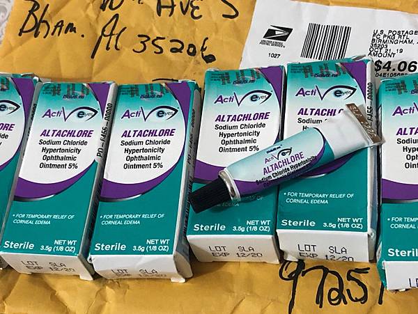 開刀後,醫生開的這瓶藥膏使用後效果很好,用完後想再買時,才知道這款Altachlore sodium 5%氯化鈉眼膏缺貨缺很久,我拿的是最後一瓶,為了阿糖的眼睛也試著用另一款醫院調治的氯化鈉眼藥水,但效果沒有藥膏的顯著,於是開始尋找此款眼藥膏。